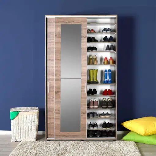 ארון הזזה שתי דלתות עם מראה המשלב תלייה ומדפים ומתאים לארון בגדים , ארון שירות , או אחסון כללי.