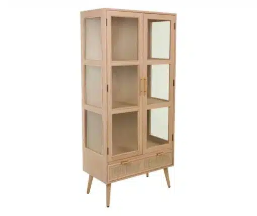 ארון ויטרינה לסלון 2 דלתות משולב בגימור עץ ,ראטן וזכוכית, בעל 3 מדפים מדפים גדולים ונוחים לאחסון ותצוגה ומגירת לאחסון רב תכליתי. הארון עשוי מאם די אף משולב עם ראטן וזכוכית בדלתות ודפנות הארון.