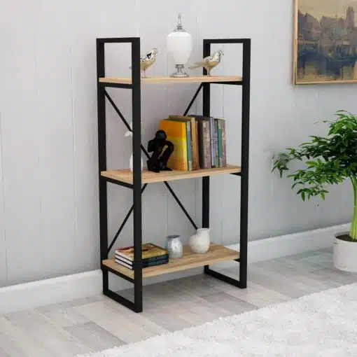 ארון מדפים פתוח לספרים לנוי או למשרד עשוי מעץ מתועש עם חיפוי מלמין פרזול שחור חזקה ויציבה. הארון בעל 3 מדפים גדולים ונוחים לאחסון.