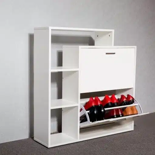 ארון נעליים עם כוורת אחסון מעוצבת , בעלת שני תאים גדולים ומרווחים לאחסון נעליים , מדפים לאחסון נוסף. הארון עשיו שבבית דחוסה עם חיפוי מלמלין. הדפנות החיצוניות של הארון בעובי 16 מ"מ ודפנות הפנים בעובי 12 מ"מ.