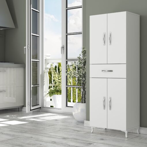 ארון 2 דלתות רוחב 50 ס"מ בצבע לבן . עשוי מעץ מתועש עם חיפוי מלמין בתו תקן אירופאי. בעל 4 מדפים גדולים ונוחים לאחסון ומגירה הנכה על מסילה טלסקופית. הארון מעוצב בסגנון נקי וקווים ישרים.