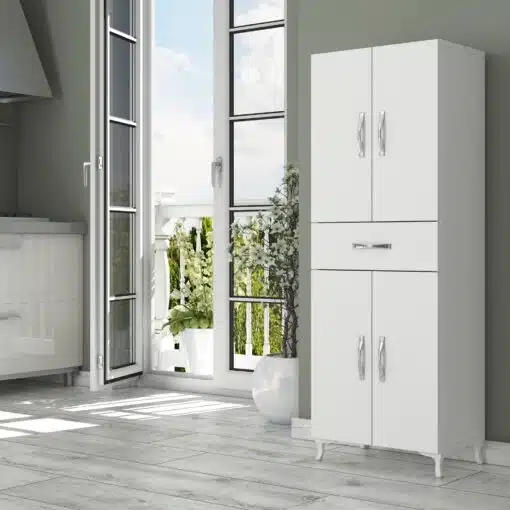 ארון 2 דלתות רוחב 50 ס"מ בצבע לבן . עשוי מעץ מתועש עם חיפוי מלמין בתו תקן אירופאי. בעל 4 מדפים גדולים ונוחים לאחסון ומגירה הנכה על מסילה טלסקופית. הארון מעוצב בסגנון נקי וקווים ישרים.