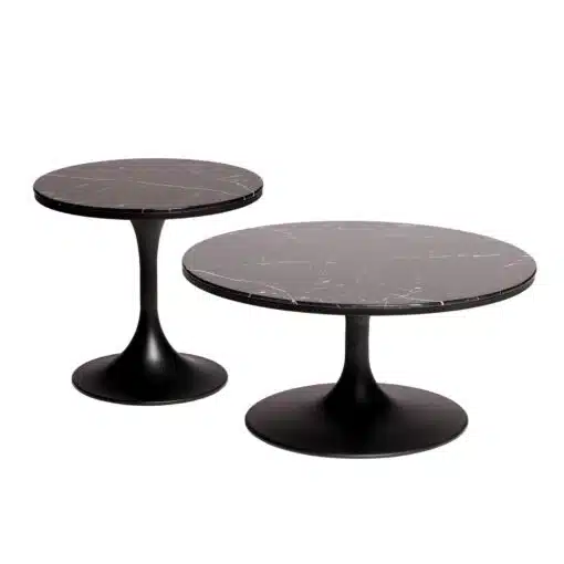 סט שולחנות עגולים לסלון , עם משטח דמוי שיש  שחור   עם טקסטורה אבסטרקטית , בסיס השולחן עשוי פרזול בגימור שחור. שולחנות קפה אלו במראה נקי קלים לתחזוקה וניקוי.
