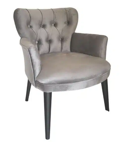 כורסאת יחיד קטנה ומעוצבת היטב בסגנון קפיטונאג' ומרופדת היטב בבד קטיפה איכותי עמיד בצבע אפור, ספוג איכותי בצפיפות גבוה , רגלי הכורסא עשויות מעץ מלא בגוון שחור.