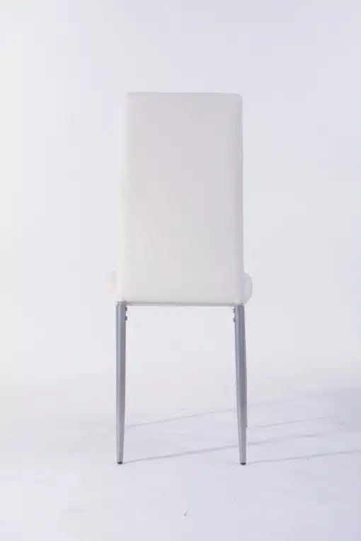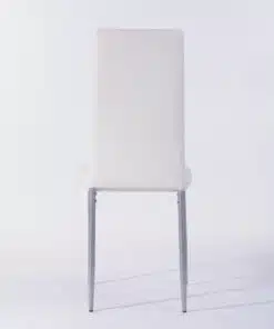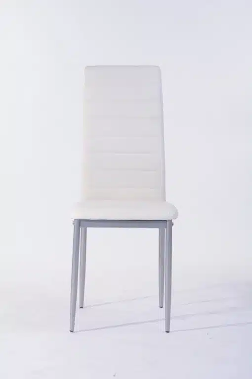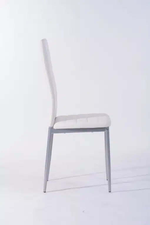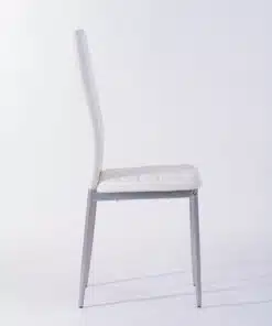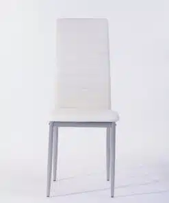 כסאות זולים לפינת אוכל מרופדים בדמוי עור לבן ומסגרת אפורה. המושב ומשענת הגב הגבוה מרופדים היטב בספוג בדרגות קושי שונות שיבטיחו נוחות לארוך זמן, המסגרת עשויה מתכת אל חלד בצבע אפור בצביעה אלקטרוסטטית איכותית.