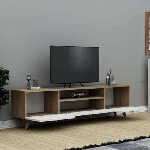 מזנון טלוויזיה רוחב 140 ס"מ משולב עם לבן וגוון אלון , בעל תאי אחסון נפתחים על ידי קלאפות ומדף פתוח במרכז עבור הממיר. המזנון עשוי מעץ מתועש עם חיפוי מלמין יצוק.