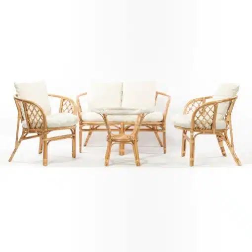 סט ריהוט למרפסת או לגינה עשוי מבמבוק טבעי בגימור ועיצוב יפהיפה. מגיע עם כריות בבד חזק עמיד ורחיץ. הסט מגיע עם שני כורסאות יחיד , כורסא דו מושבית אחת ושולחן קפה תואם.