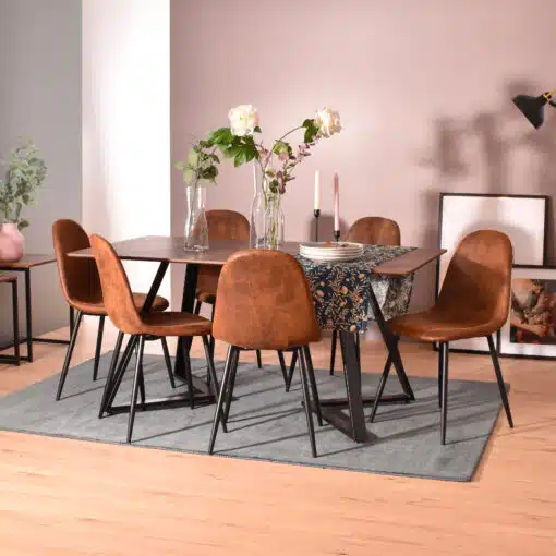 שולחן פינת אוכל מעוצב בגוון עץ אגוז מתאים ל-6 סועדים , פלטת השולחן עשויה מ-MDF בחיפוי מלמין איכותי ועמיד, מסגרת השולחן עשויה ממתכת אל חלד חזקה ויציבה בצבע שחור. פלטת השולחן בנויה משתי פלטות היוצרות משטח כולל 160 ס"מ אורך. השולחן מתאים כשולחן לחדר ישיבות.