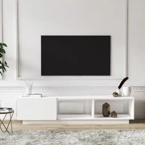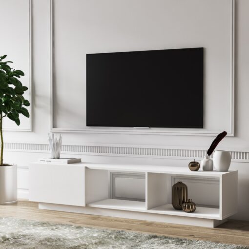 שידת טלוויזיה מעוצבת לסלון בצבע לבן עם 3 מדפי אחסון פתוחים בגב להשחלה קלה ונוחה של הכבלים , בצד אחד קלאפה נפתחת . המזנון עשוי משבבית דחוסה בעובי 18 מ"מ עם חיפוי מלמין יצוק בתו תקן אירופאי.