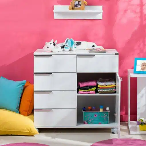 השידה ניידת על גלגלים וניתן להזיז אותה לשימוש מודלרי. הידה עשויה משבבית דחוסה עם חיפוי מלמין לבן