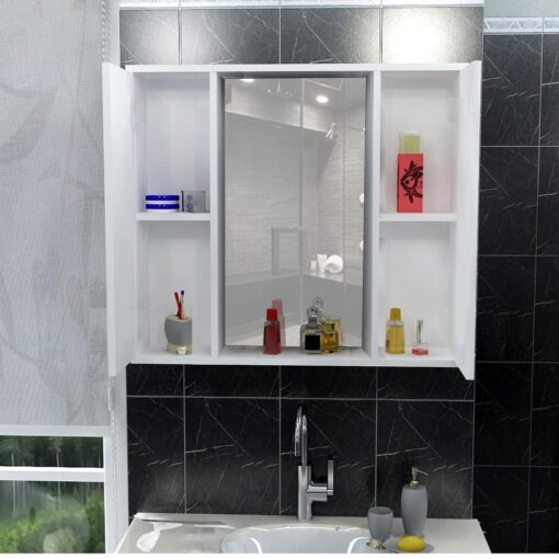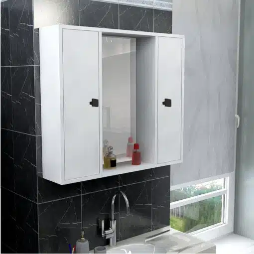 ארון אמבטיה לתלייה עם מראה עם שתי דלתות אחסון ומדפי אחסון. הארון עשוי מעץ מתועש עם חיפוי מלמין איכותי.