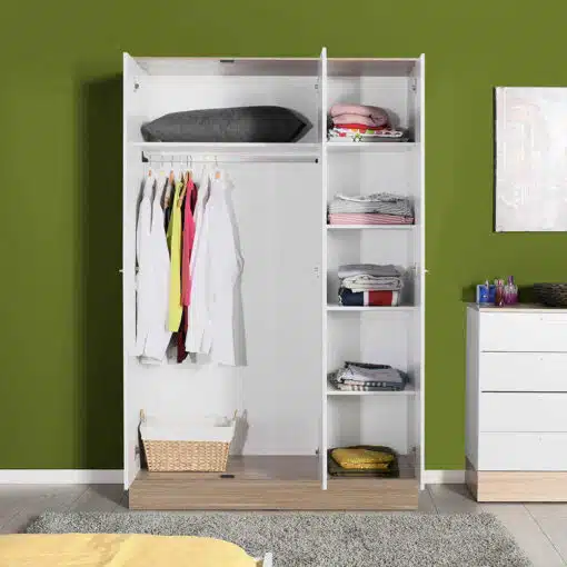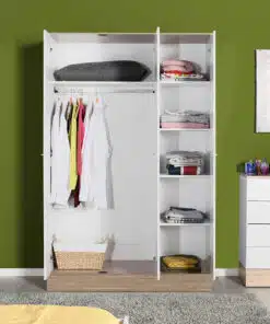 ארון הבגדים המודרני הזה הוא השילוב המושלם בין עיצוב אלגנטי לפונקציונליות. עם שילוב צבעים עדין של לבן וחום בהיר, הוא משתלב בקלות בכל חדר שינה ומעניק לו מראה מסודר ומתוחכם.