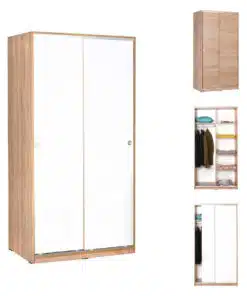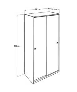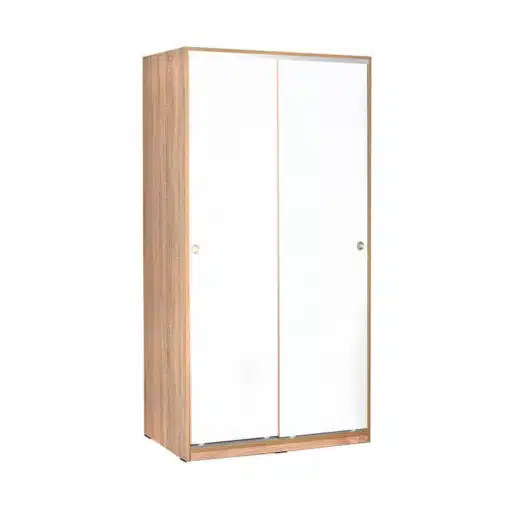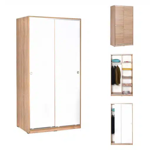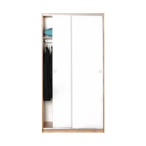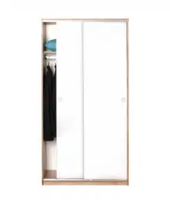 ארון הזזה 2 דלתות לבן רוחב 94 ס"מ צד תלייה וצד מדפי אחסון , ארון פרקטי ונוח כולל 6 מדפי אחסון ומתקן תלייה לקולבים. בארון יש סה"כ 6 מדפי אחסון חלקם מודולריים וניתן לרווח אותם ע"פ הצורך.