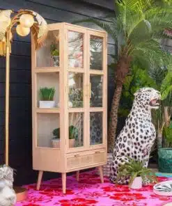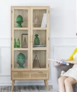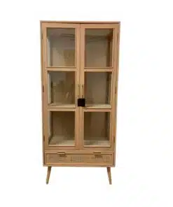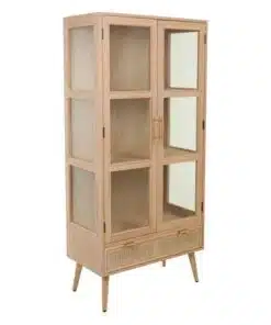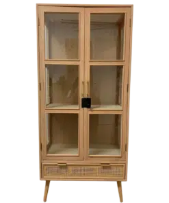 ארון ויטרינה לסלון 2 דלתות משולב בגימור עץ ,ראטן וזכוכית, בעל 3 מדפים מדפים גדולים ונוחים לאחסון ותצוגה ומגירת לאחסון רב תכליתי. הארון עשוי מאם די אף משולב עם ראטן וזכוכית בדלתות ודפנות הארון.