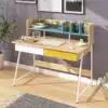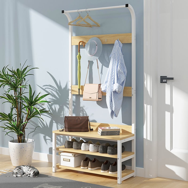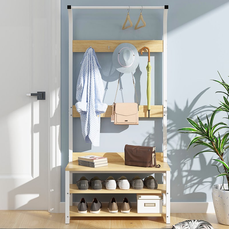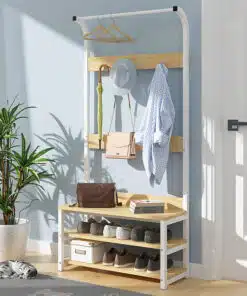 ארון כניסה לבית עם תלייה למעילים ותיקים ומדפי אחסון . הארון עשוי מאם די אף עם חיפוי מלמין יצוק משולב עם מסגרת מתכת אל חלד בצבע לבן.