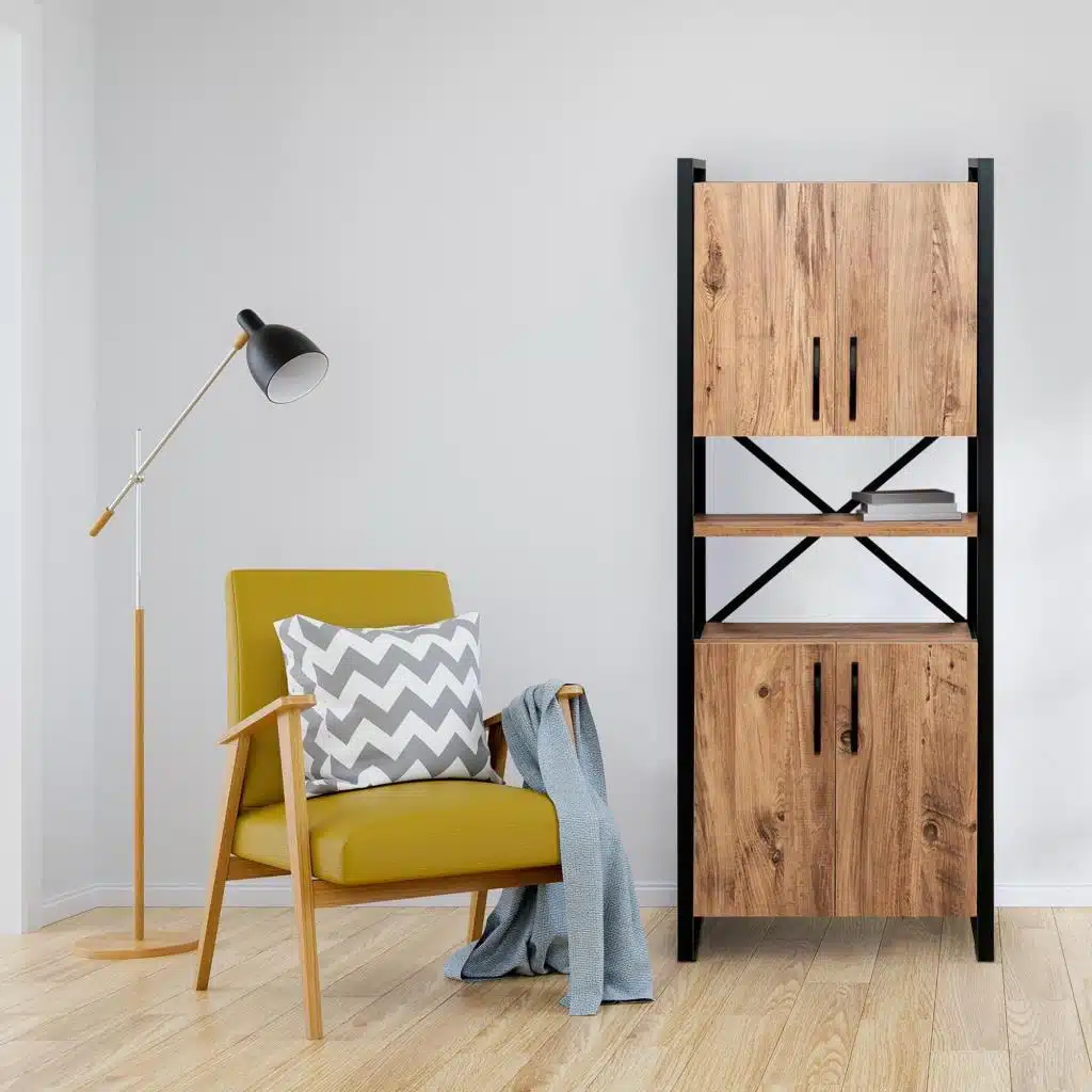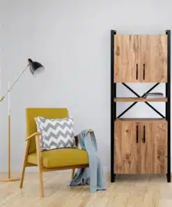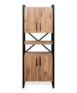 ארון מדפים עם פרזול ועץ . לארון 4 דלתות ומדפים נוחים ופרקטיים לאחסון . הארון מעוצב וישתלב לצד עיצובים וסגנונות שונים. הארון עשוי מעץ מתועש עם חיפוי מלמין יצוק בגוון עץ , מסגתר הארון עשויה ממתכת אל חלד חזקה ויציבה בצבע שחור .