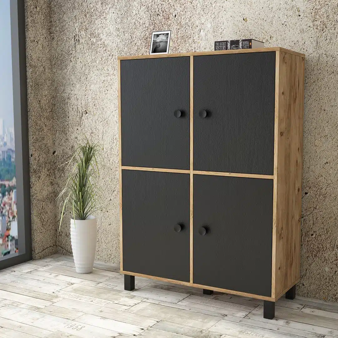 ארון שירות מעוצב עם 4 דלתות ומדפים לאחסון , עשוי מעץ מתועש עם חיפוי מלמין יצוק בגוון עץ משולב עם שחור.