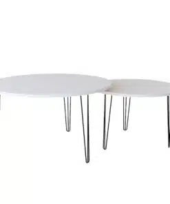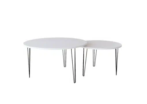 זוג שולחנות עגולים לסלון בצבע לבן. פלטת השולחנות עשויה מעץ מתועש עם חיפוי מלמין יצוק , רגלי השולחנות עשויות מתכת אל חלד בצבע שחור.