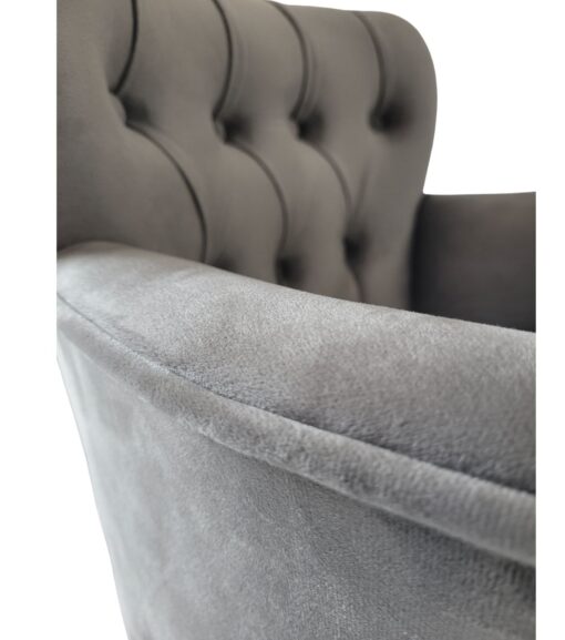 כורסאת יחיד קטנה ומעוצבת היטב בסגנון קפיטונאג' ומרופדת היטב בבד קטיפה איכותי עמיד בצבע אפור, ספוג איכותי בצפיפות גבוה , רגלי הכורסא עשויות מעץ מלא בגוון שחור.