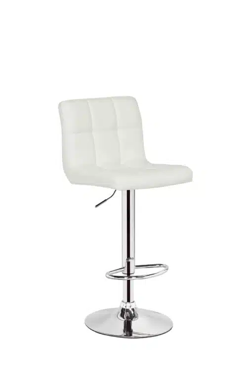 כיסא בר מסתובב לבן מעוצב בסגנון מודרני וקו נקי. הכסא מרופד היטב בספוג איכותי ועמיד, דמוי עור משובח וקל לניקוי. מסגרת הכיסא עשויה ממתכת אל חלד בצפוי כרום המעניקה לכיסא מראה יוקרתי ונקי, הכיסא מצויד בבוכנה פנאומטית להעלאה והורדה של מושב הכיסא הכיסא.
