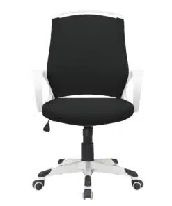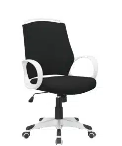 כיסא משרדי מעוצב בבד שחור ומסגרת לבנה. הכיסא מרופד היטב בספוג איכותי ביותר ומספק תמיכה מעולה לגב ומאתין אלו שעובדים שעות מרובות מול המחשב או על שולחן הכתיבה, הכיסא מרופד בבד נעים ונושם , מנגנון הכיסא כולל בוכנה פנאומטית לכוונן את גובה הכיסא הרצוי ולבלום זעזועים.