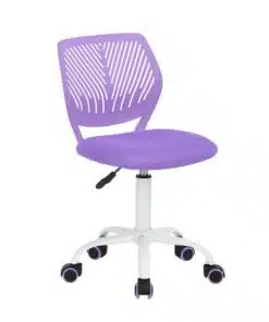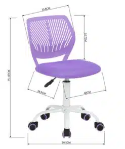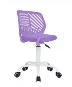 כיסא משרדי מעוצב בצבע סגול , איכותי נוח וקומפקטי, מושב מרופד ונוח משענת הגב עם בעיצוב מחורר ונושם. גובה הכיסא מתכנונן על ידי מנגנון עם בוכנה איכותית ועמידה, בסיס הכיסא אלגנטי בצבע לבן עשוי ממתכת איכותי אל חלד בצבע לבן. בסיס הכיסא עם 5 גלגלי הכיסא מסיליקון עם סיומת בצבע סגול מסתובבים בצורה חלקה ושקטה.
