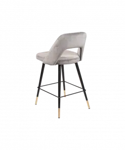 כסאות בר אפורים בבד קטיפה משובח מרופדים היטב בספוג איכותי בצפיפות גבוהה. מסגרת הכיסאות עשויה ממתכת אל חלד ממקשה אחת להבטיח עמידות ויציבות אופטימלית. הכסאות צבועים בצביעה אלקטרוסטטית איכותית ועמידה, קצוות הכיסאות מוזהבות ומספקות מראה יוקרתי ושיקי.