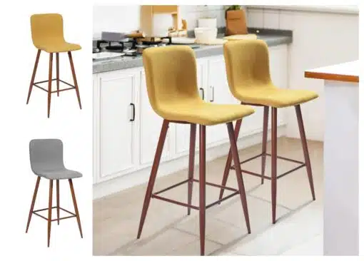 כסאות בר בבד אפור לאי במטבח או לבר הביתי. הכסאות מרופדים היטב בספוג ובד איכותי ועמיד . מסגרת הכסאות עשויה ממתכת אל חלד בגוון עץ. הכסאות מעוצבים בסגנון קלאסי וישתלבו עם מגוון סגנונות ועיצובים .