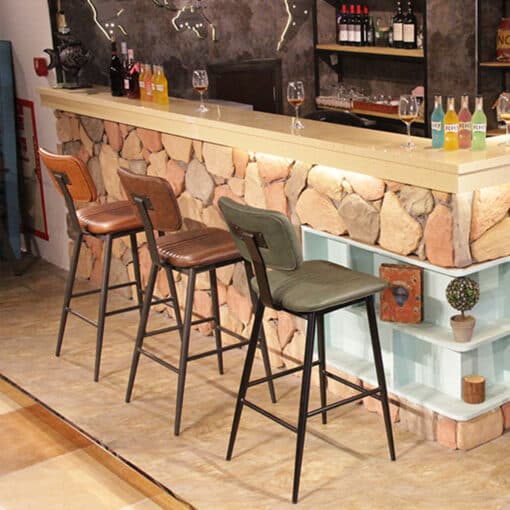 כסאות בר מעור חום מעוצבים ומרופדים היטב בספוג איכותי בצפיפות גובה , מסגרת הכסאות עשויה ממתכת אל חלד חזקה ויציבה בצביעה אלקטרוסטטית איכותית בצבע שחור.