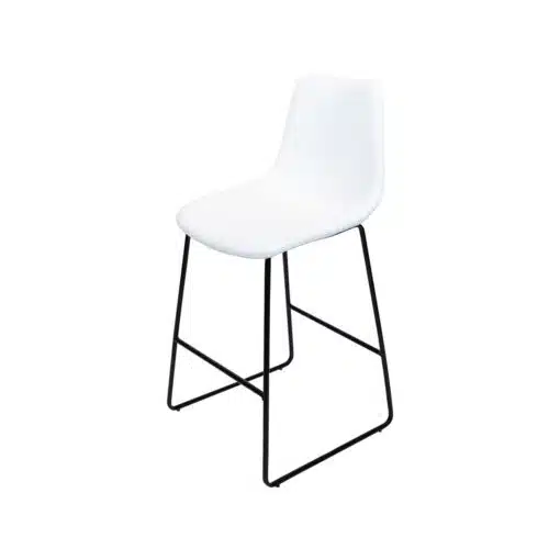 כסאות בר לבנים בדמוי עור לבן. כסאות אלו מרופדים היטב בספוג ודמוי עור איכותי עמיד וקל לניקוי, מסגרת הכסאות עשויה ממתכת אל חלד בצבע שחור. הכסאות יציבים וחזקים ונוחים במיוחד גם בישיבה ממושכת.