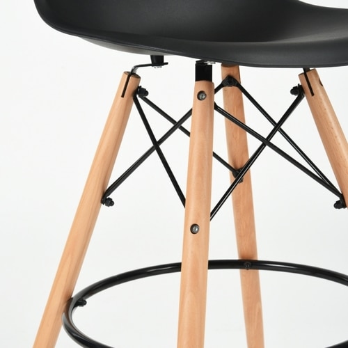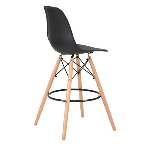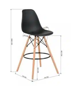 כסאות בר מעוצבים בצבע שחור עשויים מפלסטיק פולימר שחור חזק עמיד וקל לניקוי. בסיס הכיסא והרגליים בגימור עץ משולב עם משענת רגליים ממתכת אל חלד בצבע שחור.