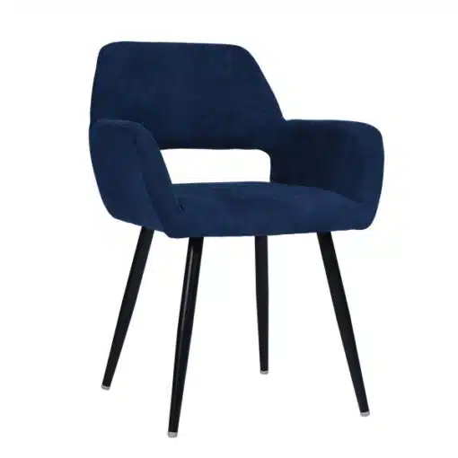 כסאות פינת אוכל בבד כחול כהה מעוצבים ומרופדים היטב בבד איכותי וספוג עמיד בצפיפות גובה , מסגרת ורגלי הכסאות עשויים ממתכת אל חלד בצבע שחור חזק ויציבה.