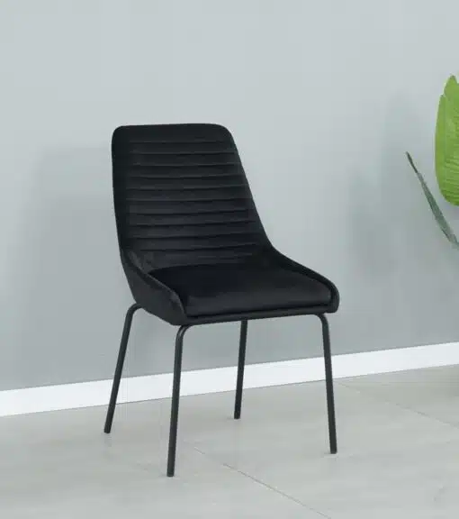 כסאות שחורים מקטיפה לפינת אוכל , כסאות אלו מרופדים היטב בבד קטיפה איכותי ומעיד ספוג בצפיפות גבסוה שגם הוא יבטיח לך עמידות לאורך זמן, מסגרת הכסאות עשויה ממתכת אל חלד בצביעה אלקטרוסטטית איכותית בצבע שחור.