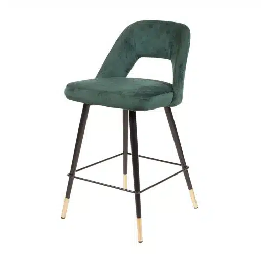 כסא בר קטיפה ירוק מרופד היטב בספוג איכותי בצפיפות גובה ובד קטיפה איכותי דוחה כתמים. מסגרת הכסא עשויה ממתכת אל חלד ממקשה אחת צבועה בצביעה אלקטרוסטטית איכותית בצבע שחור, קצוות רגלי הכסא מוזהבות.
