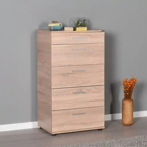 - גמישות באחסון: מגירה עליונה בגובה 12 ס"מ וארבע מגירות תחתונות בגובה 22 ס"מ, מאפשרות ארגון אופטימלי של החפצים.