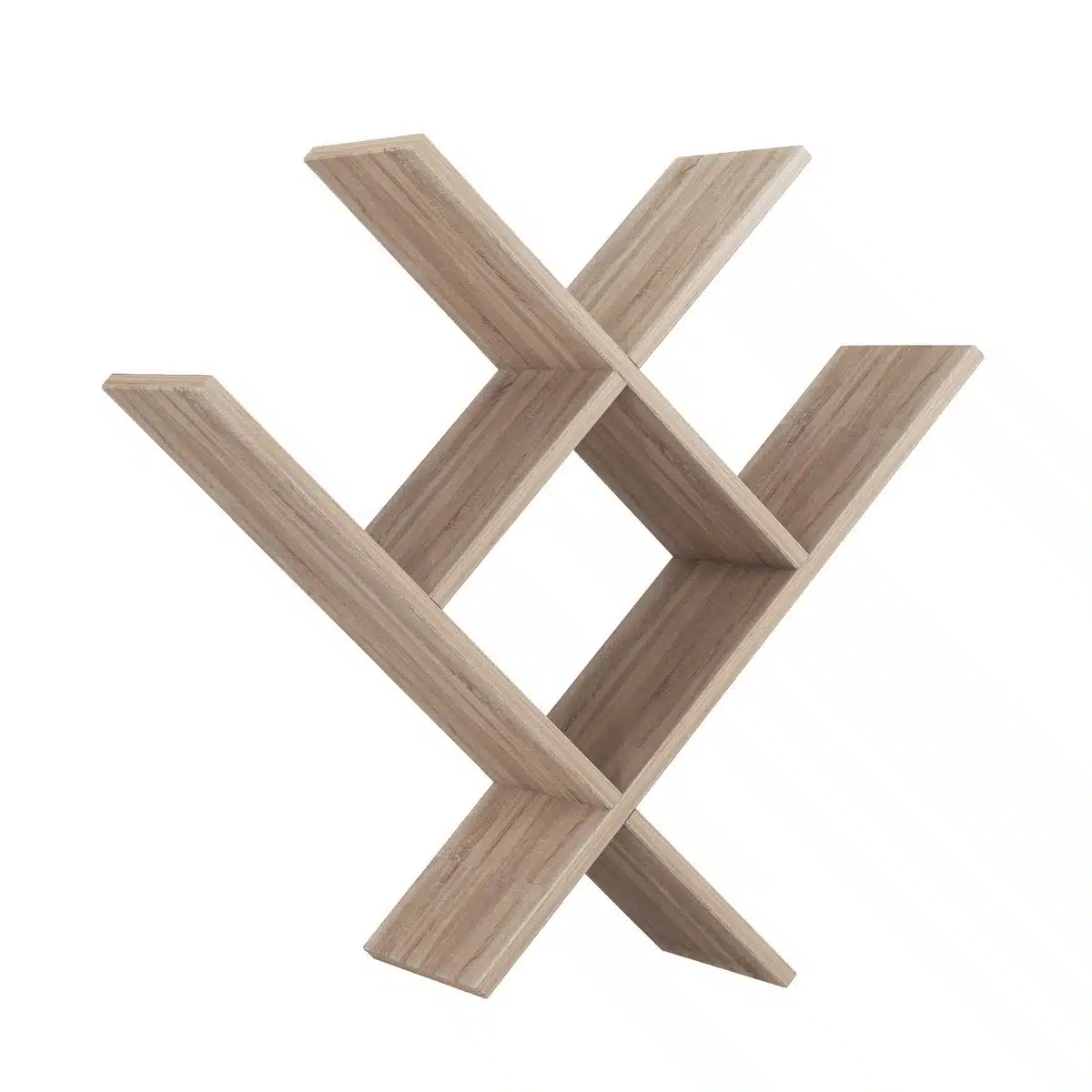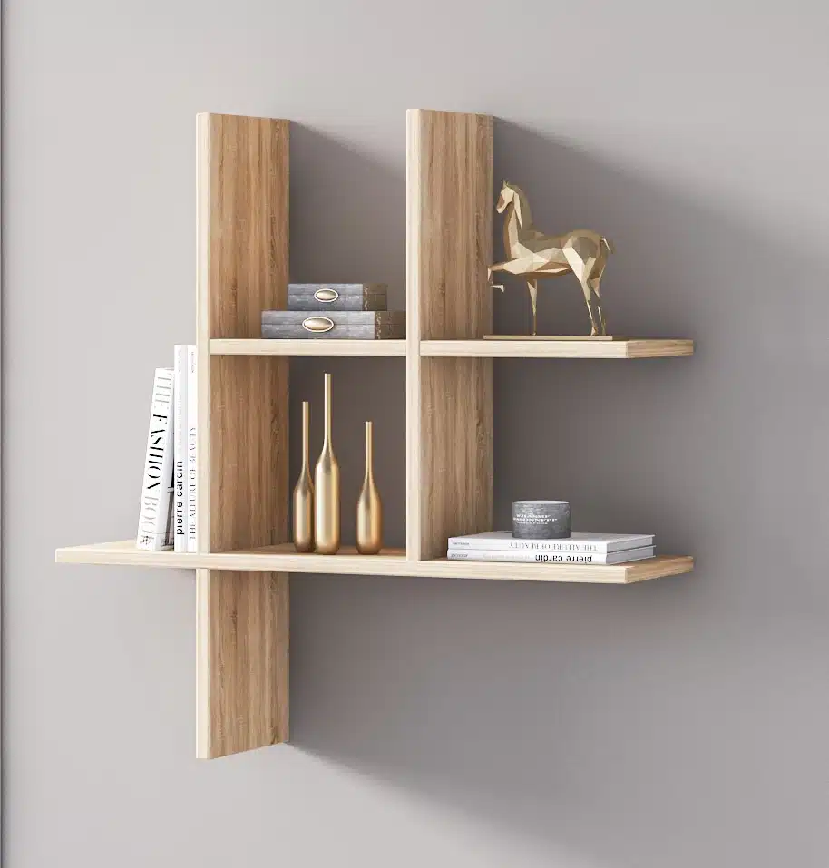 מדף מעוצב ניתן לתלייה בסגנון כוורת בצבע אלון עשוי מעץ מתועש עם חיפוי מלמין יצוק.