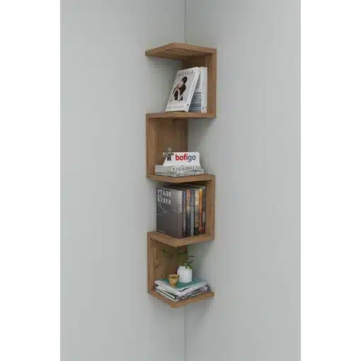 מדף פינתי מעוצב מעץ מתועד עם חיפוי מלמין בגוון עץ