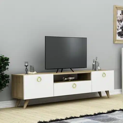 מזנון טלוויזיה רוחב 140 ס"מ משולב עם לבן וגוון אלון , בעל תאי אחסון נפתחים על ידי קלאפות ומדף פתוח במרכז עבור הממיר. המזנון עשוי מעץ מתועש עם חיפוי מלמין יצוק.