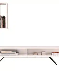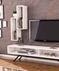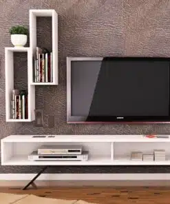 מזנון טלוויזיה לבן בעיצוב מודרני עם סט מדפים תואמים במתנה