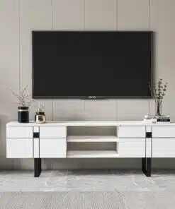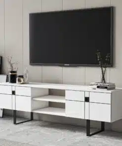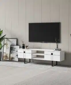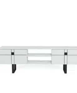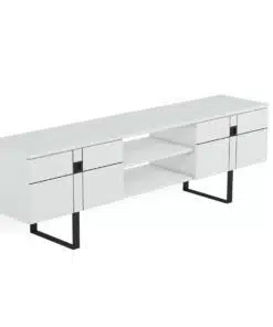 מזנון טלוויזיה לבן מעוצב , עשוי מעץ מתועש עם חיפוי מלמין יצוק ורגלי מתכת אל חלד. המזנון מעוצב היטב וישתלב לצד עיצובים וסגנונות שונים.