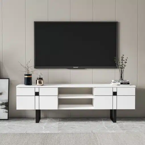 מזנון טלוויזיה לבן מעוצב , עשוי מעץ מתועש עם חיפוי מלמין יצוק ורגלי מתכת אל חלד. המזנון מעוצב היטב וישתלב לצד עיצובים וסגנונות שונים.