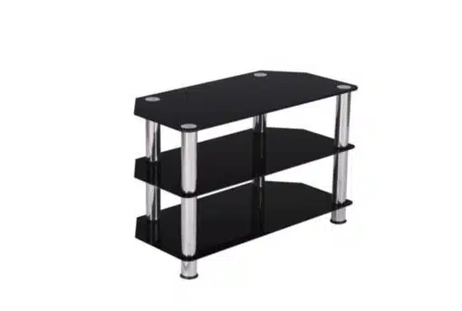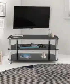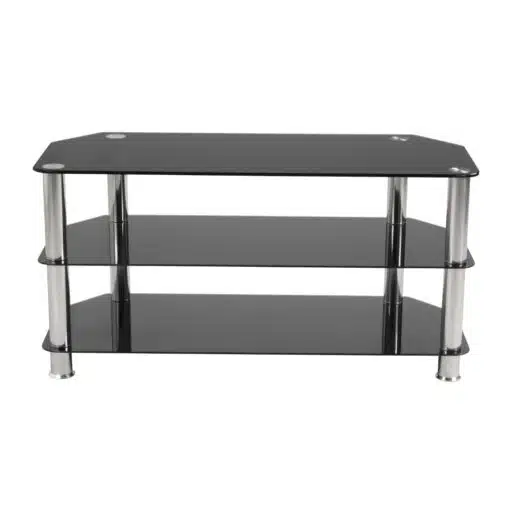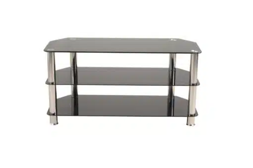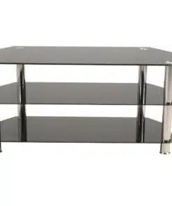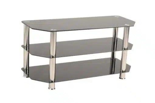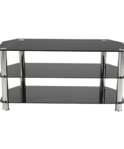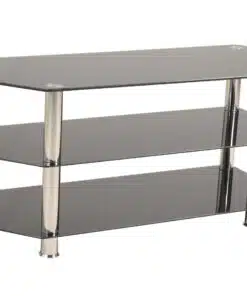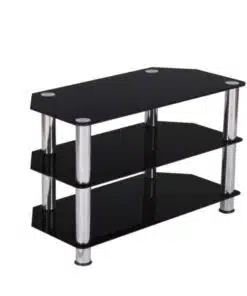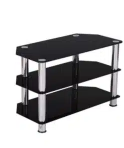 מזנון לטלוויזיה מזכוכית שחורה ורגלי כרום בצורת צינורות . המדפים עשווים זכוכית מחוסמת בעובי 6 מ"מ מדף העליון יתר המדפים 5 מ"מ . המזנון בקווים נקיים ומודרניים ומתאים למי שמחפש מראה מודרני ויוקרתי ובמלי לתפוס שטח רב בסלון.