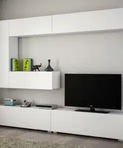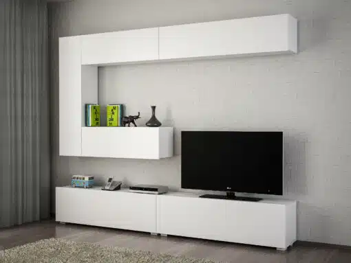 מזנון לטלוויזיה מעוצב בצבע לבן בעיצוב מודרני וקווים נקיים בצבע לבן בשילוב יחידה עליונה לאחסון ולהנחת פרטי נוי. המזנון מכיל שטח אחסון רב . המזנון עשוי שבבית דחוסה בעובי 18 מ"מ בציפוי מלמין יצוק באיכות גבוהה,