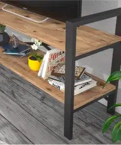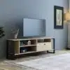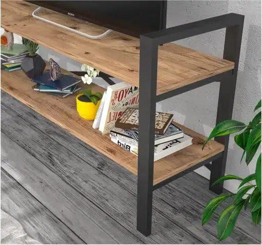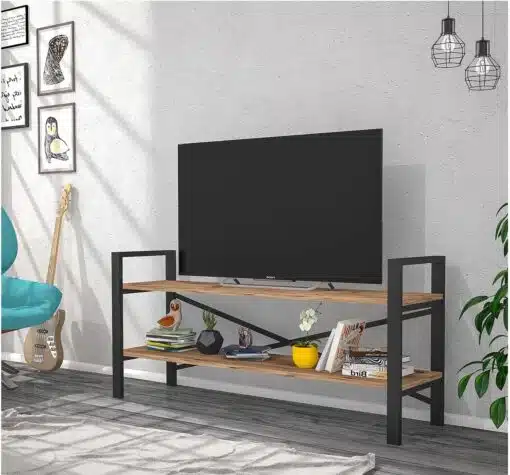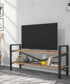 מזנון טלוויזיה בעיצוב קלאסי רוחב 120 ס"מ פתוח עם שני מדפים גדולים נוחים לאחסון עשויים מעץ מתועש, רגלי המזנון עשויות ממתכת אל חלד בצביעה אלקטרוסטטית איכותית בגוון שחור.