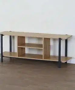 עיצוב יוקרתי: שילוב של גוון עץ טבעי עם מתכת מושחרת יוצר מראה אלגנטי ומודרני. תאי אחסון פתוחים לתצוגה ואחסון.