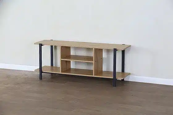 עיצוב יוקרתי: שילוב של גוון עץ טבעי עם מתכת מושחרת יוצר מראה אלגנטי ומודרני. תאי אחסון פתוחים לתצוגה ואחסון.