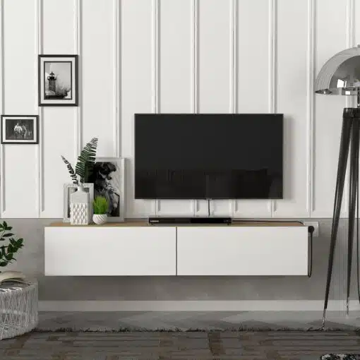 חפש פתרון אחסון אלגנטי ופונקציונלי לסלון שלך? מזנון הצף שלנו, המשלב בין לבן טהור לגוון עץ אלון חמים, הוא הבחירה המושלמת!