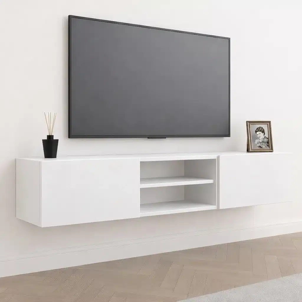 מזנון תלוי לטלוויזיה זמין בגוון לבן קלאסי המתאים לכל סגנון עיצוב מודרני:
