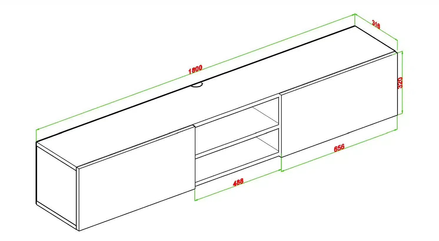 המידות המדויקות של מזנון טלוויזיה צף זה הן: רוחב 180 ס"מ, גובה 32 ס"מ ועומק 32 ס"מ. רוחב התא הפתוח המרכזי הוא כ-49 ס"מ, המספיק למגוון רחב של מכשירים אלקטרוניים. בחלקו האחורי של המזנון קיימים פתחים מיוחדים להעברת כבלים, המאפשרים חיבור נוח ומסודר של כל ציוד החשמל ללא כבלים חשופים.