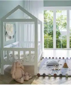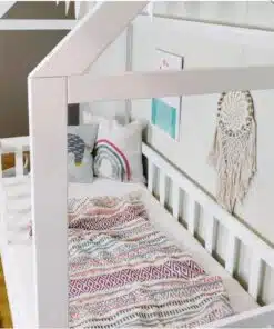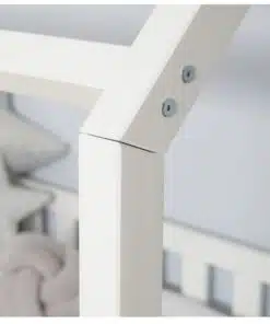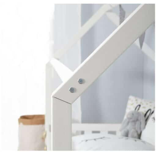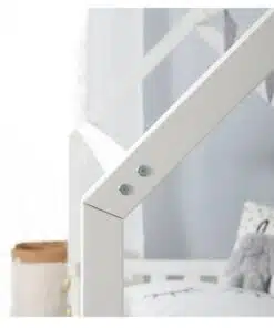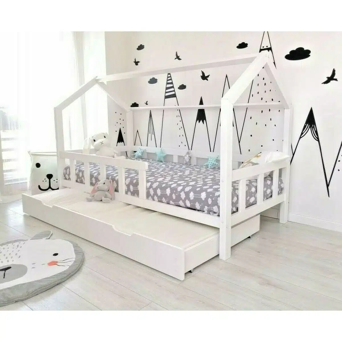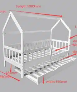 מיטת ילדים עם מיטת חבר מעוצב עם גג. המיטה מגיעה עם זוג מזרונים ומעקה בטיחות. מיטת החבר נשלפת בקלות רבה באמצעות גלגלים . המיטה עשויה מעץ אורון מלא וצבועה בצביעה איכותית ביותר.